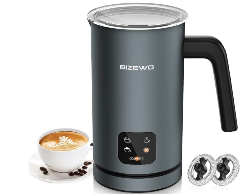 BIZEWO の 4-in-1 電動ミルク泡立て器は、「ホット密泡・ホット軽泡・冷泡・ミルク加熱」の4モード切り替え可能+タッチパネル操作といった、思い切った機能仕様が特徴。