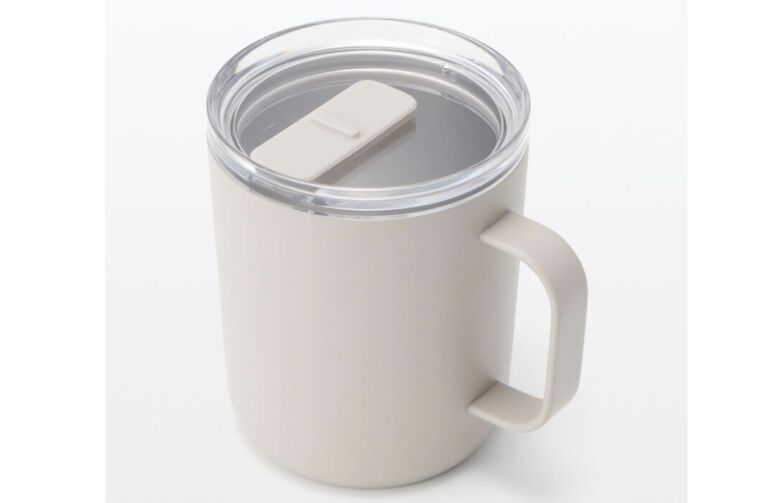 10. ふた付きでこぼれにくい「無印良品 目盛り付き 保温保冷 蓋付きマグカップ グレーベージュ」
