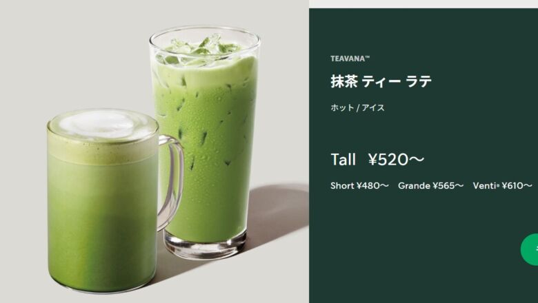 | 第3位 | 抹茶 ティー ラテ | ![]() ![]() | ショート トール グランデ ベンティ | ショート:510円〜 トール:550円〜 グランデ:595円〜 ベンティ:640円〜 | ショート:172 トール:231 グランデ:324 ベンティ:424 | あり | ・全部ミルク(無料) ・エスプレッソショット追加(+55円) ・抹茶パウダー増量(無料) |