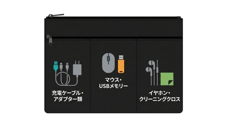 充電ケーブルやモバイルバッテリーなどガジェット類を持ち運ぶなら、中綿入りのフラットポーチが安心です。買い物用のエコバッグ兼用なら、ポケッタブルタイプを選びましょう。